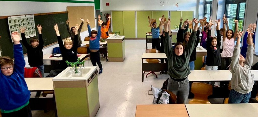 Nach einer kurzen Stärkung ging es im Biologieraum bei NaWi-Lehrerin Anne Müller wissenschaftlich weiter: Die Kinder erforschten den Zusammenhang zwischen Bewegung, Blutkreislauf und Puls und übten, ihren Herzschlag zu messen. Passend zum Motto des Tages „Stabile Sache – bewegt durch den Schulalltag“ durften auch hier Bewegungsübungen nicht fehlen. In der dritten Einheit wurde das Gelernte praktisch angewandt. Nach Seilspringen und Laufeinheiten verglichen die Schülerinnen und Schüler Ruhe-, Belastungs- und Erholungspuls. So erfuhren sie, wie wichtig Pulsmessung im Training ist – um die Intensität zu steuern, gezielt in verschiedenen Herzfrequenzbereichen zu trainieren und Überlastung vorzubeugen. Zum Abschluss warteten mit „Feuer, Wasser, Sturm“ und „Zombieball“ zwei Spielklassiker, die für viel Spaß und Bewegung sorgten. Erschöpft, aber glücklich blickten die Kinder auf einen unvergesslichen Vormittag zurück. Auch ihre Klassenlehrerin Frau Hauswirth zeigte sich begeistert vom gelungenen Aktionstag.