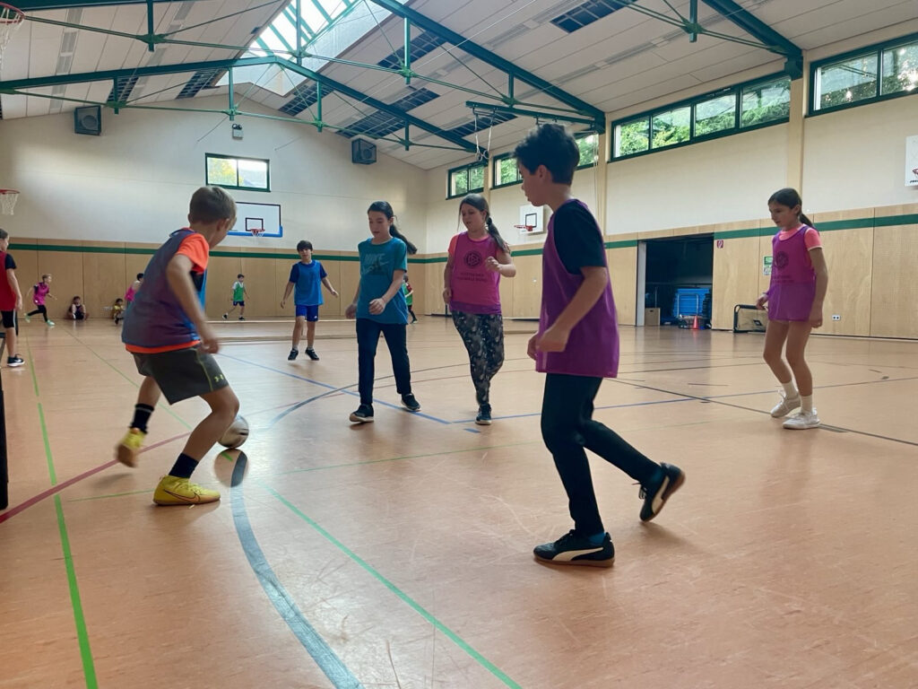 Bereits zu Beginn gab es ein Highlight: Bundestrainer Julian Nagelsmann richtete sich in einer Videobotschaft direkt an die Kinder und machte ihnen Lust auf den sportlichen Vormittag. Mit Bällen, Springseilen und kleinen Toren ausgestattet, verwandelten die Sechstklässler die Turnhalle in eine energiegeladene Spielfläche. Nach dem Aufwärmen traten sie in spannenden 3-gegen-3-Partien gegeneinander an. Diese Bewegungsphase war geprägt von hoher Aktivität und Emotionalität. Die Schülerinnen und Schüler erkannten zunehmend: Es geht hier nicht ums Gewinnen oder darum, der Beste zu sein. Spielregeln konnten gemeinschaftlich geändert werden, um ein Spiel zu schaffen, das beide Mannschaften fordert und Freude bringt. Spielfähigkeit und Teamfähigkeit entwickeln und Fairplay leben waren die zentralen Lernbausteine in den ersten beiden Stunden.
